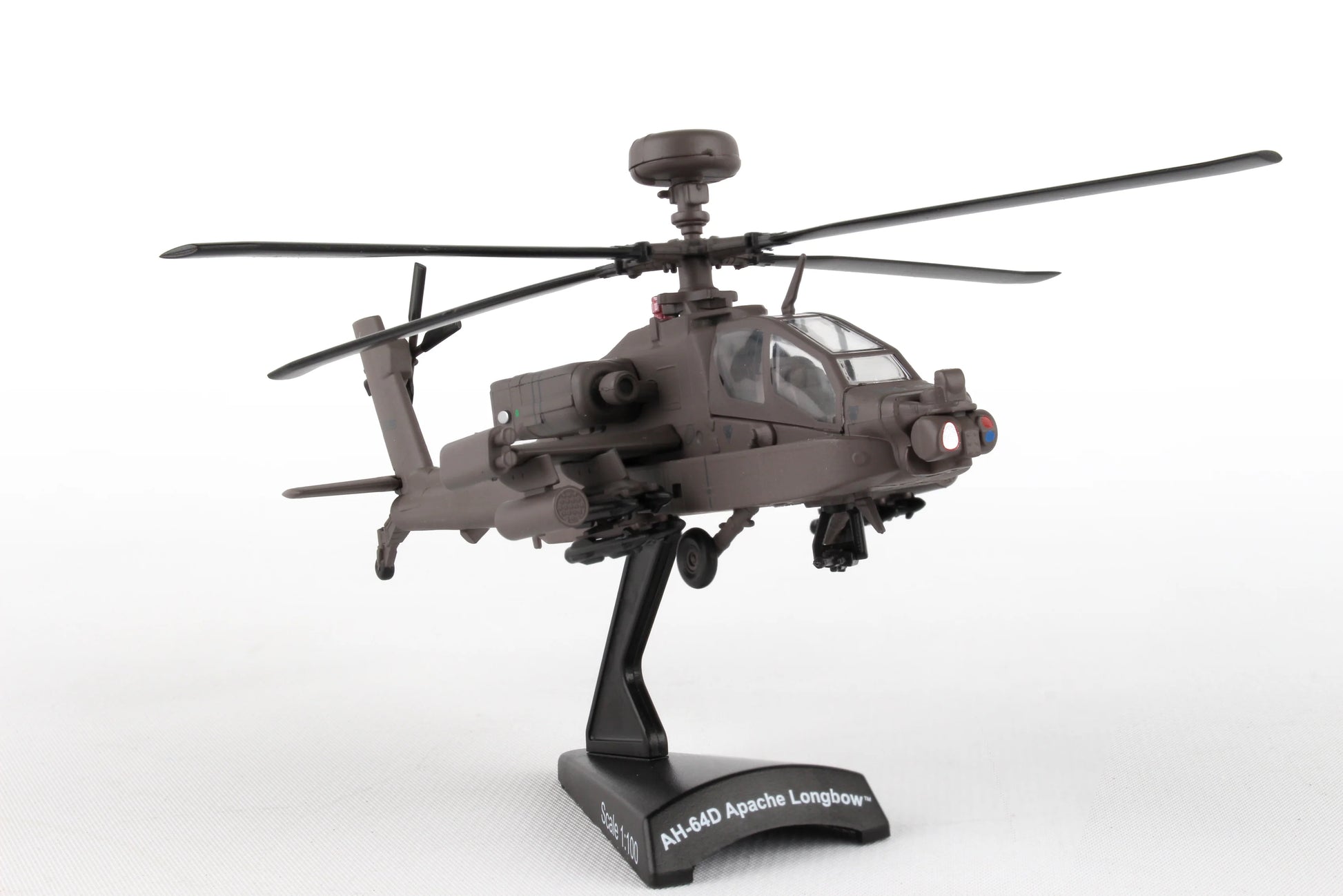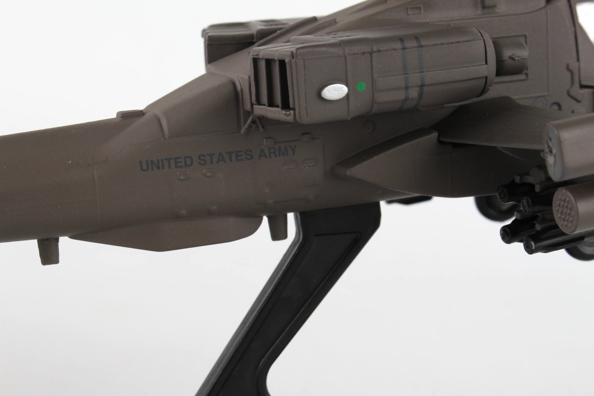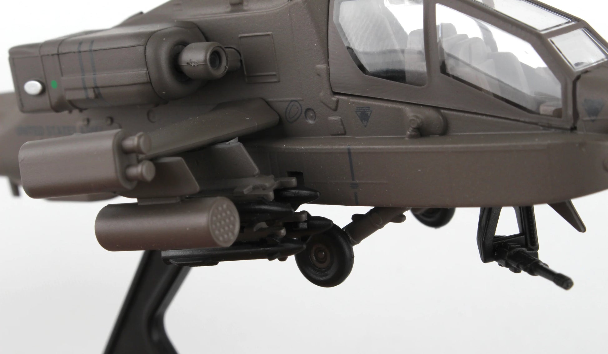 Boeing has delivered more than 2,100 Apaches to customers around the world since the aircraft entered production. The U.S. Army Apache fleet has accumulated (as of Jan 2015) more than 3.9 million flight hours since the first AH-64A was delivered to the U.S. Army in 1984. This Die-cast metal attack helicopter model comes in 1:110 scale with plastic stand and is approximately 6 inches long with 2 1/2 inch wingspan, and 5 3/4 inch rotor diameter.
