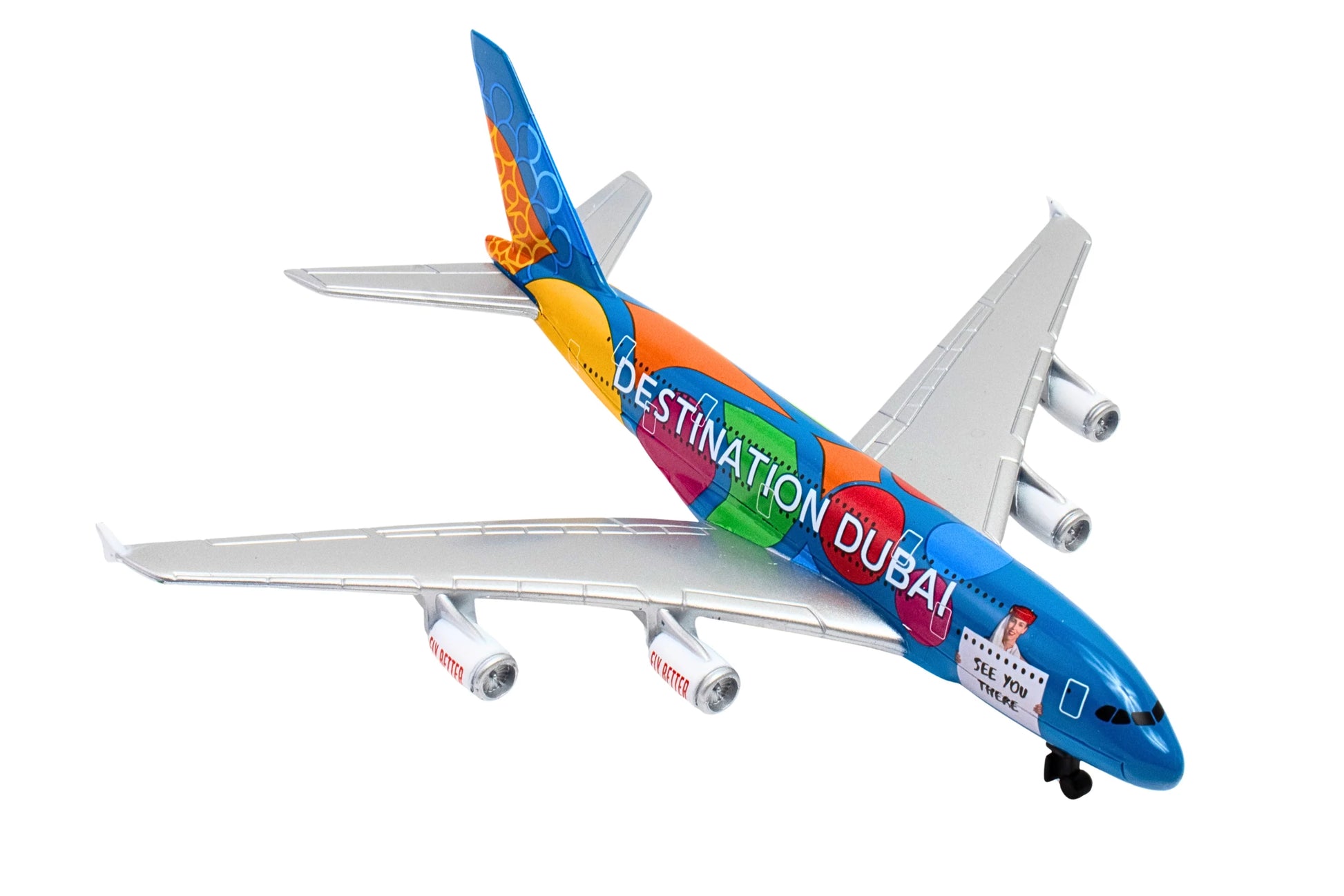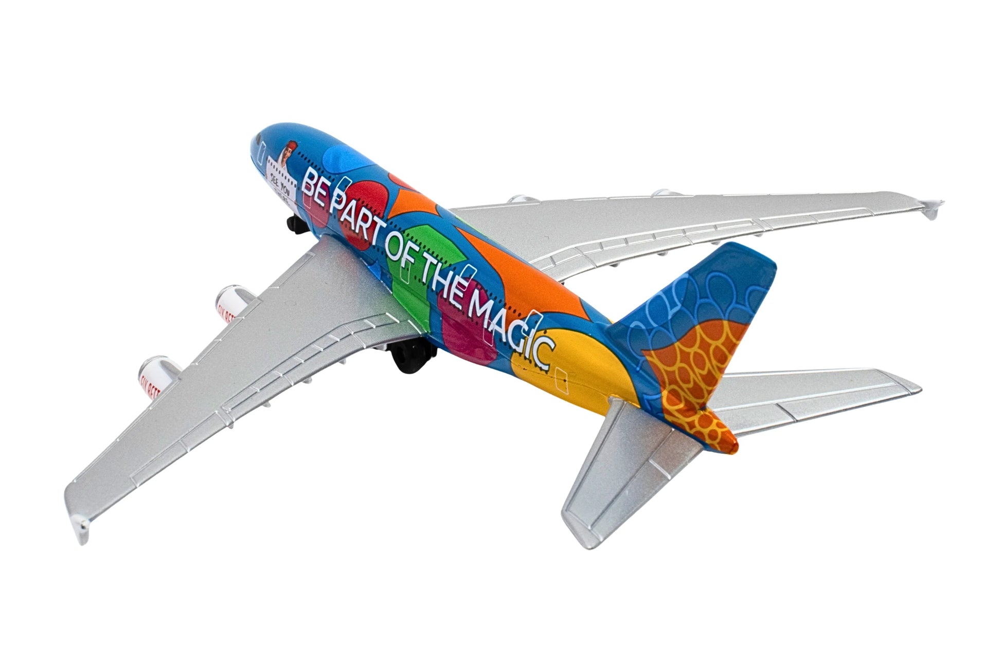 In 2020, Emirates celebrated their home city, Dubai with a bright livery design specially created for the Dubai Expo 2020. Decorated in orange, green, and blue, the colors represented the three themes of the event: Opportunity, Sustainability, and Mobility. This die-cast airplane authentically recreates the color scheme of this commemorative aircraft, and includes the phrases, 'Destination Dubai' on one side and 'Be Part of the Magic' on the other, just like the real-life airplane. With lower fuel consumption contributing to reduced carbon emissions, the Airbus A380 is among the most environmentally friendly airliners in the sky. The Emirates double-decker A380 is the flagship of its fleet, seating over 500 passengers. Die-cast airplane replica measures approximately 14 cm long with a 15 cm wingspan. Can be played with as a toy or displayed as a collectible. For ages 3+.