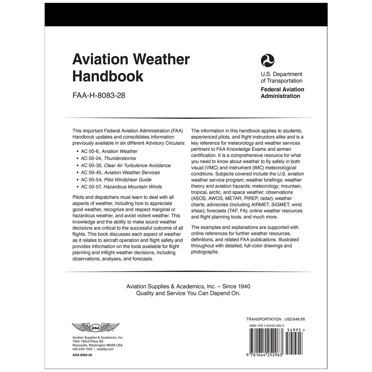 Les informations contenues dans ce manuel s'adressent aux élèves pilotes, aux pilotes expérimentés et aux instructeurs de vol. Il constitue une référence essentielle en matière de météorologie et de services météorologiques pour les examens théoriques de la FAA et la certification des pilotes. Ce guide complet vous fournit toutes les connaissances nécessaires pour voler en toute sécurité, aussi bien en conditions météorologiques de vol à vue (VMC) qu'aux instruments (IMC). Les sujets abordés incluent le programme du service météorologique aéronautique américain ; les briefings météo ; la théorie météorologique et les dangers pour l'aviation ; la météorologie ; la météorologie de montagne, tropicale, arctique et spatiale ; les observations (ASOS, AWOS, METAR, PIREP, radar) ; les cartes météorologiques ; les avis (dont AIRMET, SIGMET, cisaillement du vent) ; les prévisions (TAF, FA) ; les ressources météorologiques en ligne et les outils de planification de vol ; et bien plus encore.