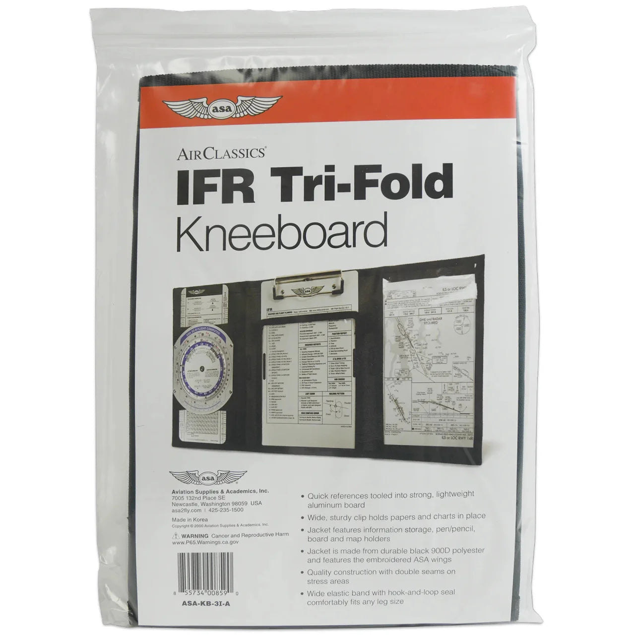 Aluminum kneeboard includes important IFR information such as flight plan equipment qualifiers, IFR alternate minimums, required reports, lost communications and more! Black 900D polyester with embroidered ASA wings logo. Made in Korea.